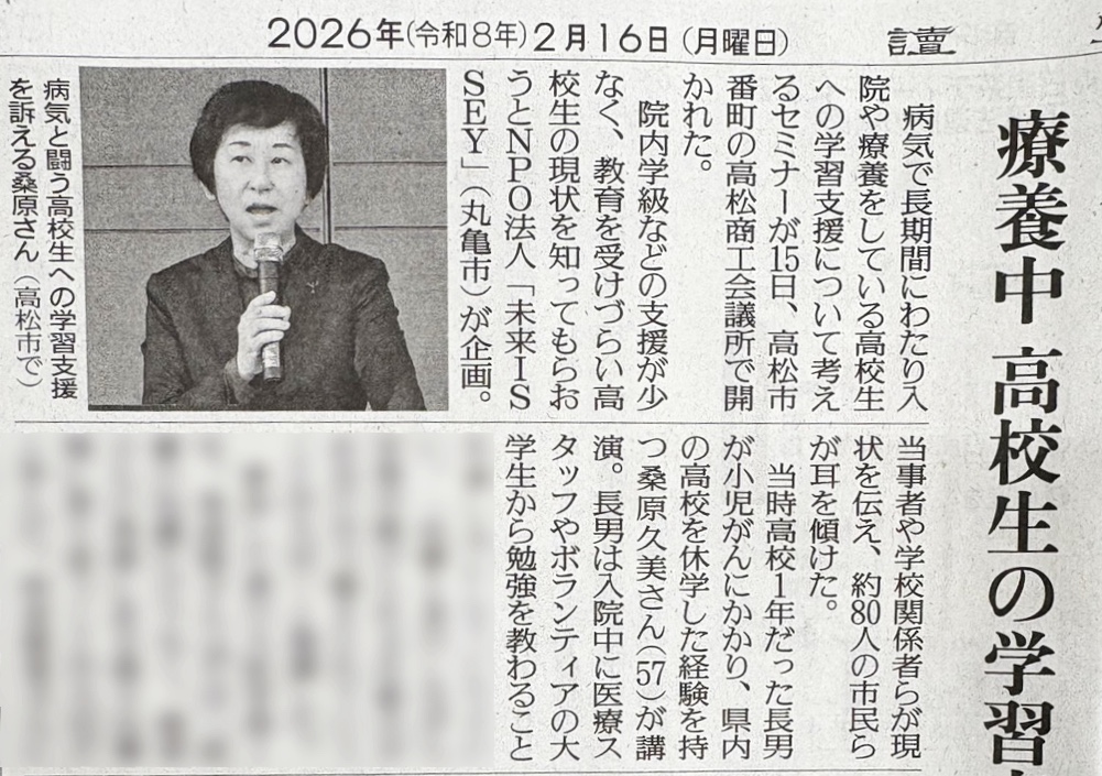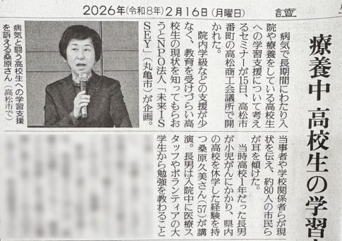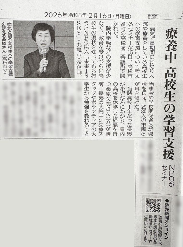 2月16日(月)の読売新聞さまの記事に、香川県高松市で開催した「病気療養中の高校生を応援する井戸端セミナー 四国大会」(2/15(日)開催)が掲載されました。