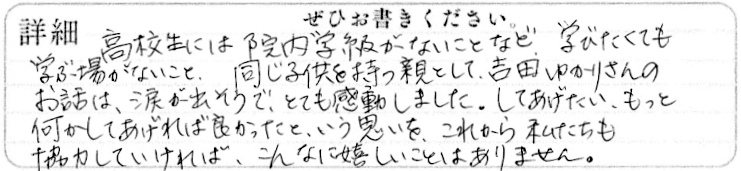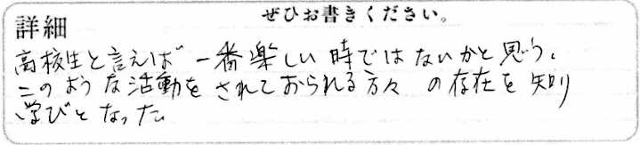 今年も引き続き、義務教育と社会人(大人)の狭間で取り残されがちな、高校生に対する支援について考えていきたいと思っています。