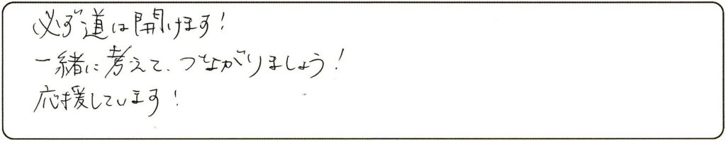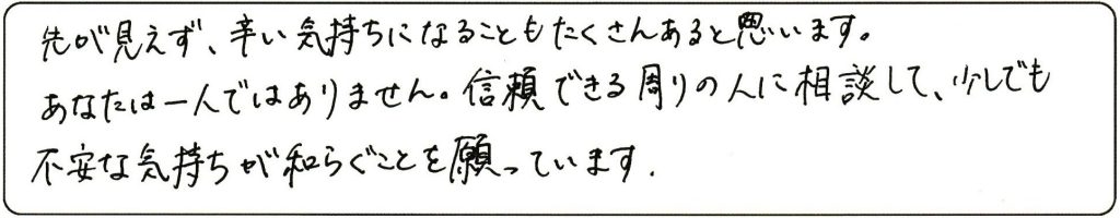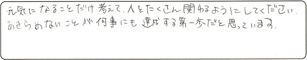 私は1 年間ほど入院をすることになり、きちんと進級してクラスのみんなと卒業出来るのか不安になっていきました。しかし、大学病院の先生や、学校の先生のサポートのおかげで、オンライン授業の形で授業に参加することができ、とても良かったです。遅れていた授業の範囲は未来ISSEYさんが丁寧に教えてくださり、無事にみんなに追いつくことができました。本当に沢山の方々のサポートのおかげで、こうして無事に進級できたと思います。おかげで今は毎日とても充実した日々を送っています。