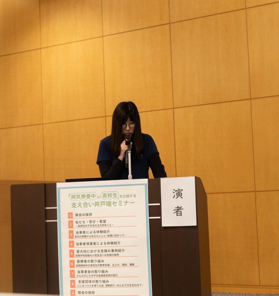 このような会で、病気と闘う高校生を取り巻く現状について、多くの人々に知ってもらうことが大事であると強く感じました。